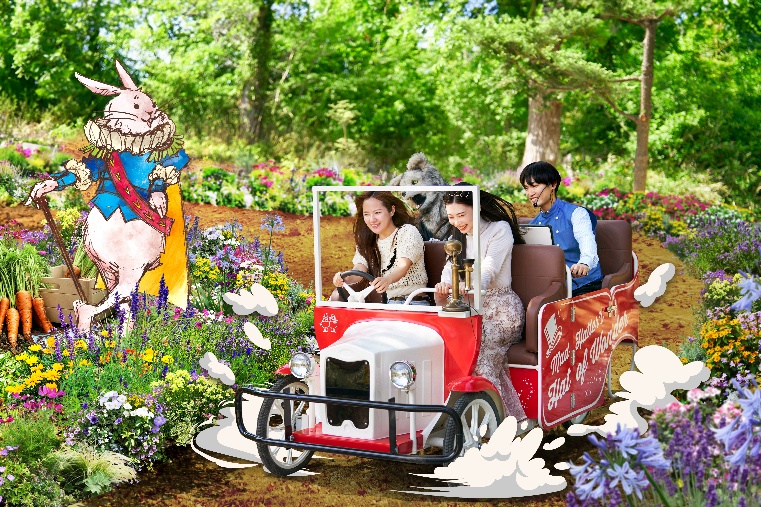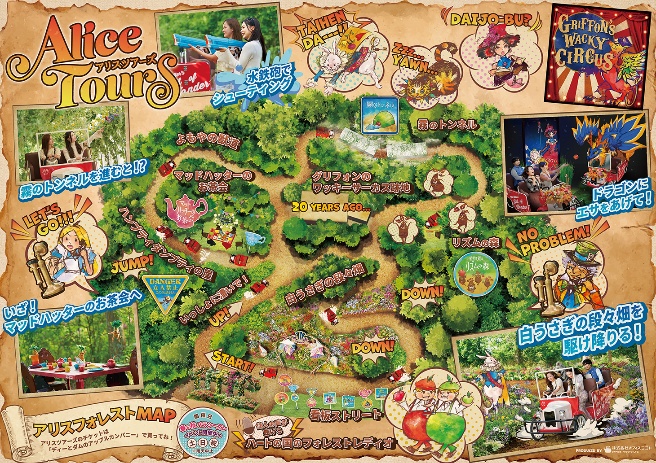 京成バラ園初の自走式ライド系アトラクションとしてデビューした、大人気アトラクションの「アリスツアーズ」が今春も再びオープンします。ゲストはドライバーのエスコートを受けながら、電動式の足漕ぎ4輪に乗り「12分間の森の探検」へ出発します。マッドハッターが準備している「森のお茶会」を見学していると、ビークルにかかってきた一本の電話をきっかけに一行は予期せぬハチャメチャな冒険へと巻き込まれてしまいます。霧のトンネルや、ドライバーの機転で始まるウォーターガンエリアでのミッション、巨大ドラゴンとの鉢合わせ、ドラゴンへの餌やり体験など、スリルと可愛らしさが満載です。「不思議の国のアリス」を原作にしたオリジナルストーリーで、キャラクターからの電話、デジタルグラフィックによるキャラクターの登場、立体的造形など、様々なキャラクター達と出会うことが出来ます。