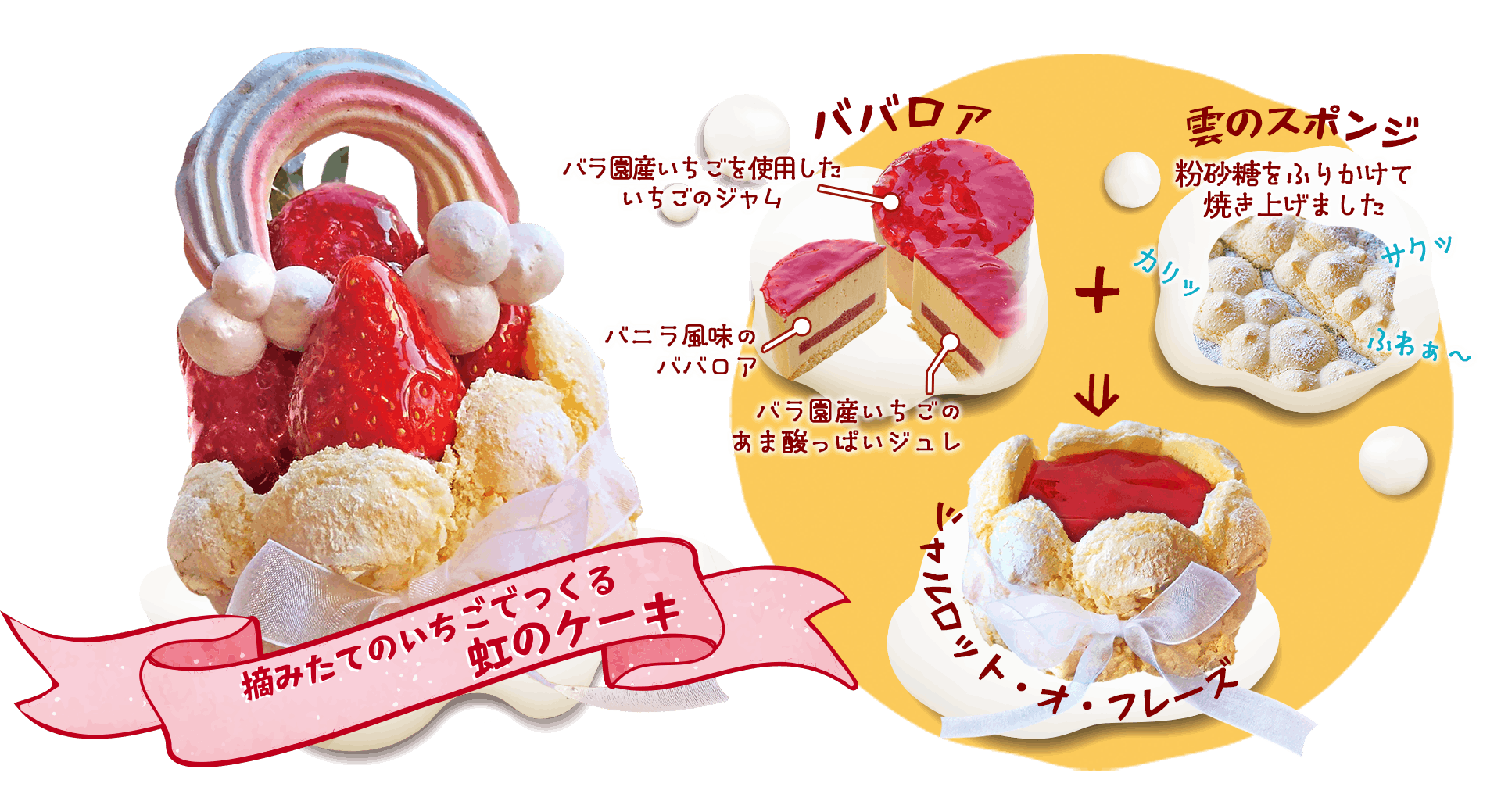 「摘みたてのいちご」と「虹のメレンゲ」を「虹のケーキ」にトッピングして完成させる体験型スイーツ
